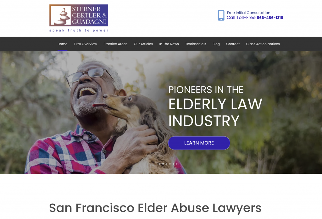 Stebner Gertler & Guadagni is a San Francisco–based law firm dedicated exclusively to elder abuse and neglect litigation, representing victims and families harmed by misconduct in nursing homes, hospitals, and assisted living facilities. The firm focuses on holding care providers accountable through complex litigation involving physical abuse, medical negligence, financial exploitation, and wrongful death in long-term care settings. With decades of experience, their attorneys advocate for the rights of vulnerable seniors while pursuing significant settlements and verdicts against negligent institutions.